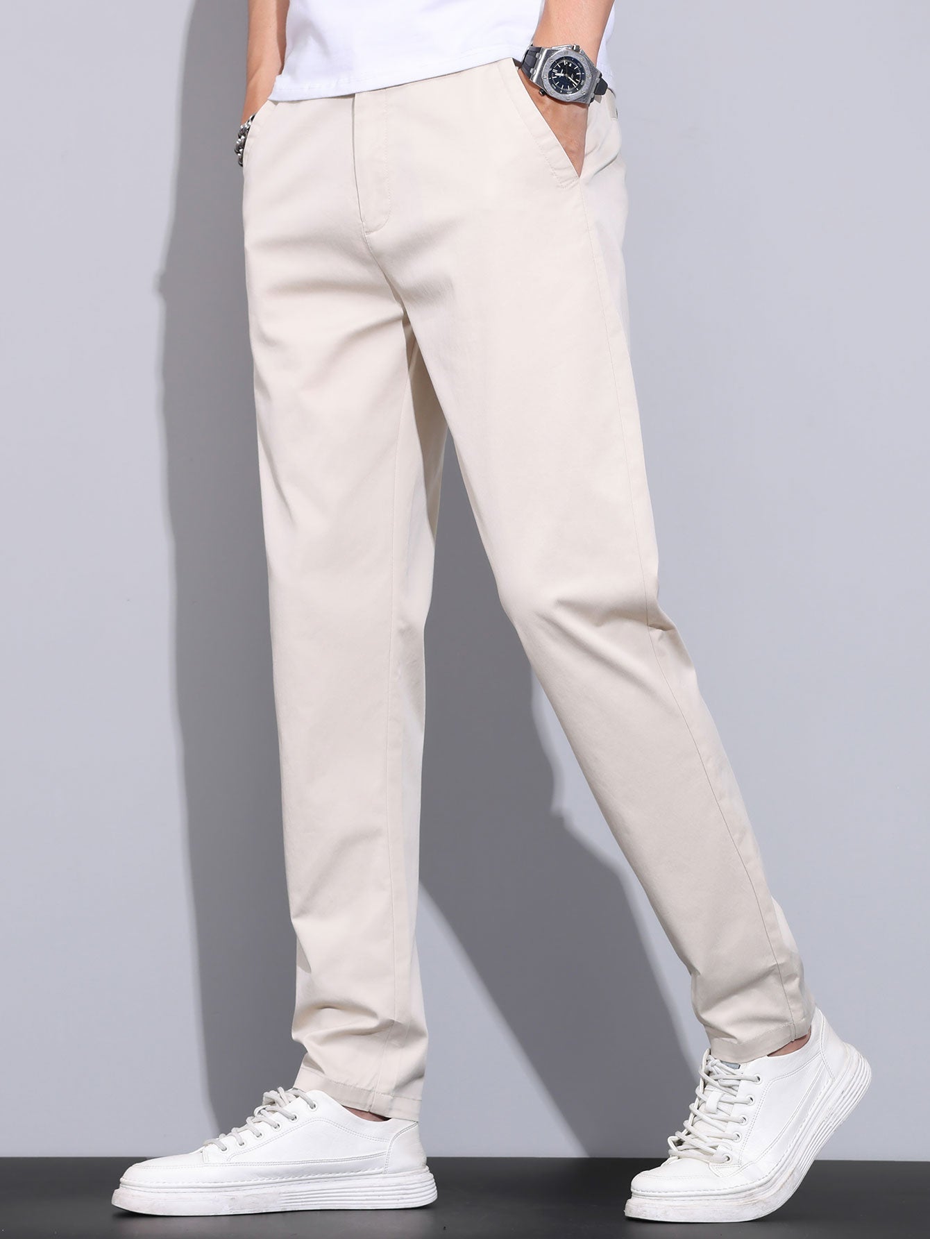 Stay effortlessly stylish and comfortable in these classic solid color straight leg trousers. Crafted from a breathable fabric, these pants feature a partially elastic waistband with button closure and zip fly for a secure fit. The clean silhouette and turned-up cuffs add a refined touch, making them perfect for both casual and smart-casual settings.