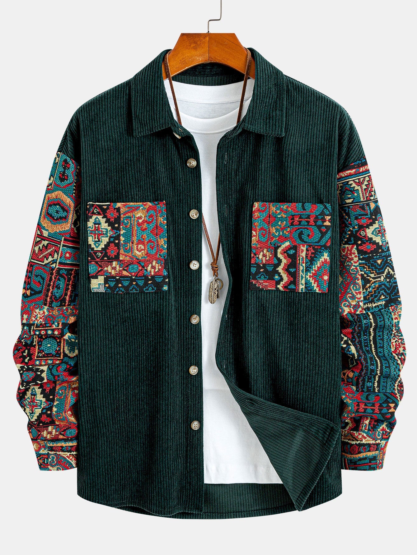 This men’s corduroy shirt features a vintage ethnic patchwork design that blends classic texture with artistic flair. Made from soft, ribbed corduroy in deep green, it offers both comfort and refined texture. The colorful ethnic jacquard patterns on the sleeves and chest pockets add a bold, eye-catching contrast.