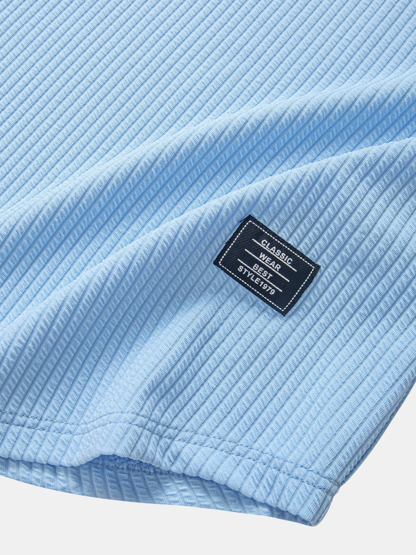This men's short-sleeved hooded T-shirt is made of three-dimensional striped knitted fabric with a delicate texture, combining fashion and practicality. The short-sleeved design with an adjustable drawstring hood adds a casual sports style, and the slightly curved hem design makes it more slim and neat. The "CLASSIC" style woven label on the left hem highlights the sense of quality in a low-key manner, suitable for daily outings, vacations or light sports scenes.